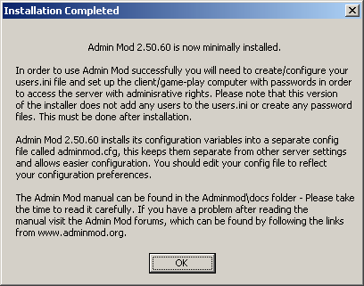 The installer now copies across the Admin Mod files to the correct folders in the Mod directoy. It changes the Mod liblist.gam file so that metamod will be loaded when the server starts (metamod loads admin and then loads the gamedll, don't worry about it). The installer also appends the line