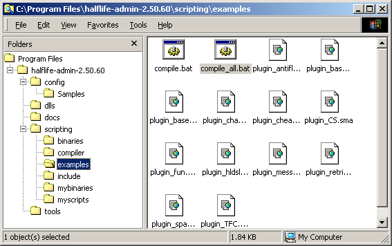 The default scripts come pre-compiled for you and in the correct location, just so long as the files and folders were unzipped properly. If you do not have the script files compiled ahead of time, or if they are not in the appropriate folder (Adminmod\scripting\examples), the above window will pop-up. As explained in the window, you simply need to run the file named compile_all.bat in the Adminmod\scripting\examples folder. Doing this will - of course - compile all of the scripts so they are ready to use. The image below shows the location of that folder in the Windows Explorer view.