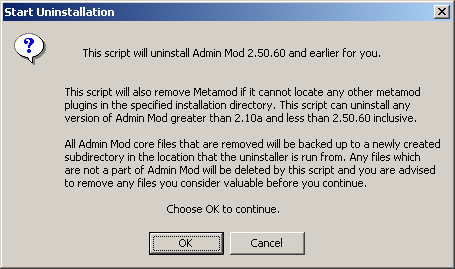 If there are no other Metamod dlls installed Metamod will be uninstalled along with Admin Mod and the following dialogue will be shown.